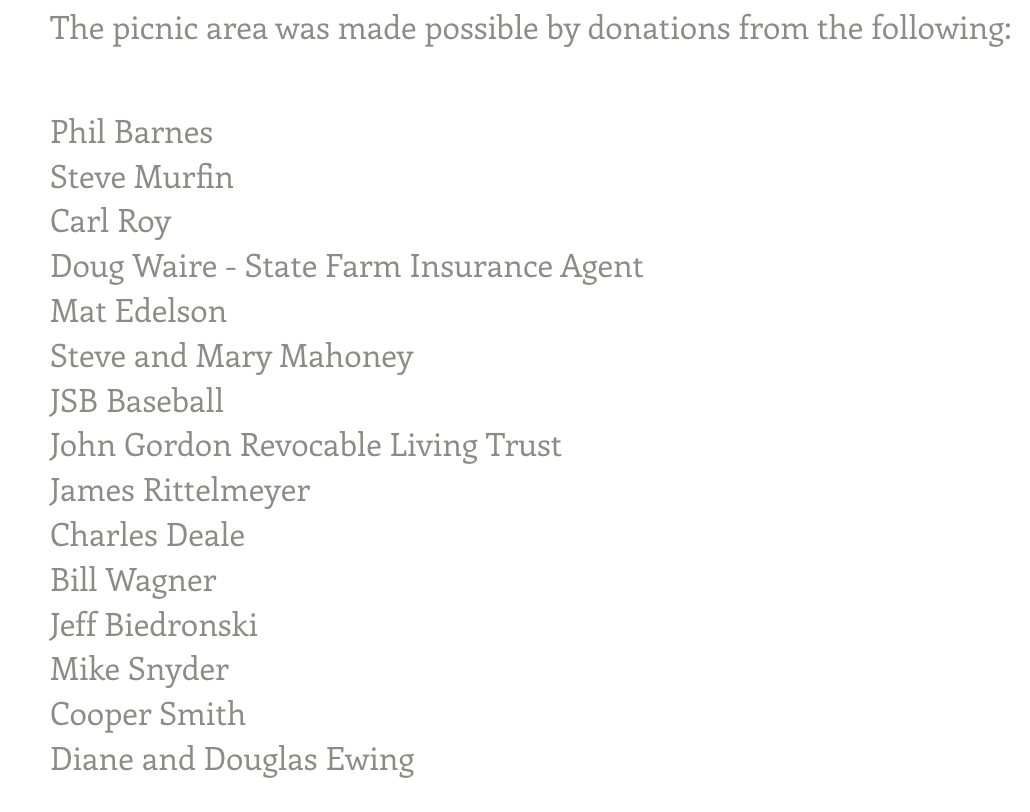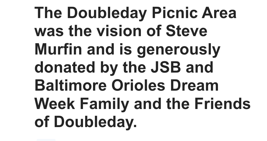 Many thanks go to the Village Staff, who helped Steve Murfin gain approvals from the Commissioners and the Friends of Doubleday Staff, who guided him throughout the process of purchasing the wood and metal frames and to get them built by the Doubleday Grounds Crew. All donators have their name listed on the Friends of Doubleday home page, as their interest in this project and contribution will enable baseball families that visit Cooperstown to enjoy the Doubleday Picnic area for many years.