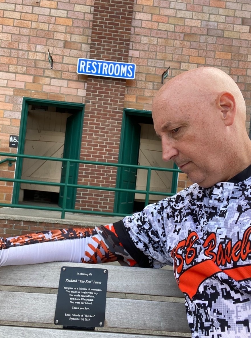 After his passing, the Baltimore Orioles Fantasy Camp and Dream Week fraternity wanted to do something to honor their baseball buddy at the home of baseball, Cooperstown. Over 150 individuals have donated to Friends of Doubleday, raising over $12,000. A bench was placed at the field inscribed with a tribute to “The Rev.” Each contributor also received a patch honoring “The Rev” that they can wear on their uniform when they play at Doubleday.