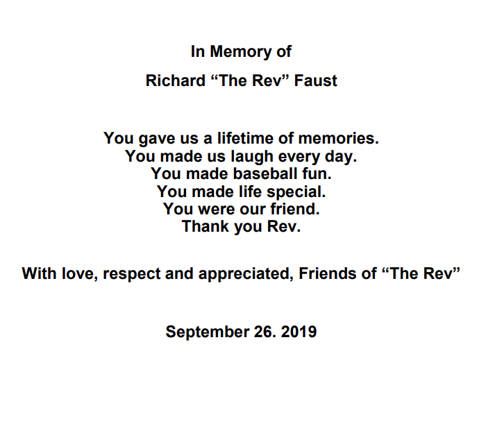 There are so many wonderful stories about our friend Richard "The Rev" Faust. Everything Richard did always had a purpose - to live life fully, treat people with kindness and laugh every day. And somehow play a little baseball with your friends. Richard befriended me for life at The Orioles Fantasy Camp the moment we met. And he maintained that friendship for the next 23 years. The one story I will share is from the last day I saw him. My Mother would come to Fantasy Camp and Camden Yards to watch me play baseball. Richard treated her as if she was his own mother. He always went out of his way to find her to say hello. And he always found a way to make her smile and often laugh. My Mother was not able to make Fantasy Camp in 2019. On the last day of Fantasy Camp that year, I was talking to her on my cell phone outside the locker room. Here comes Richard. I called him over to say "Hi" to my Mother. I couldn't get him off the phone. He had her laughing. I could hear her on the other end of the phone. Genuine laughter from the soul. I don't remember what he was saying that made her laugh. But I do remember the last thing he said to her before handing the phone back to me. He said, "Good-bye Mom. Love you." When I got the phone back, I could hear my Mother choking up. Then I did. And then she said, "He is a good man. A good friend." And that defines my relationship with The Rev. It was the last time I saw Richard. Eight months later, I led a Memorial Service in Cooperstown for Richard. It was something I just had to do...for him. God Bless you my friend. I am a better person having known you. Thank you for being you.
